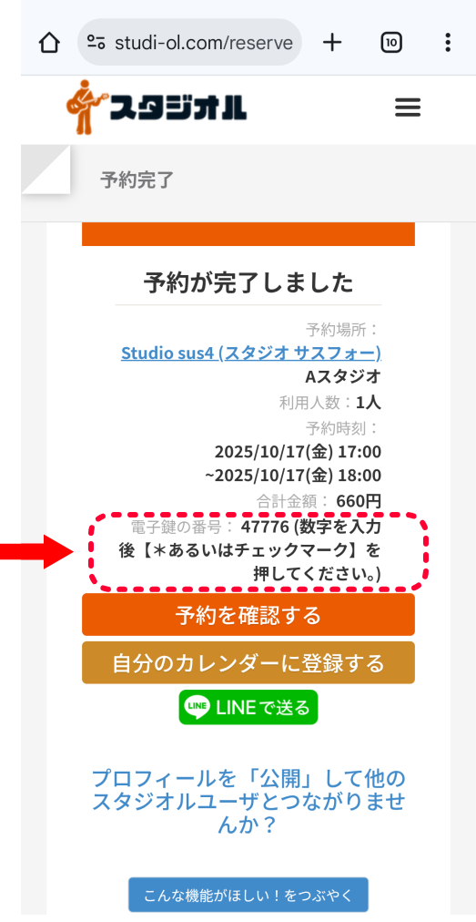 予約サイト スタジオル からオンライン予約を行ってください。予約が完了すると暗証番号が発行されます。 ![]() |